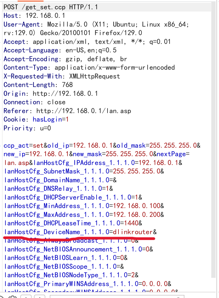 然后使用burpsuit抓包可以看到LanHostCfg_Device_Name_1.1.1.0传入了device_name。