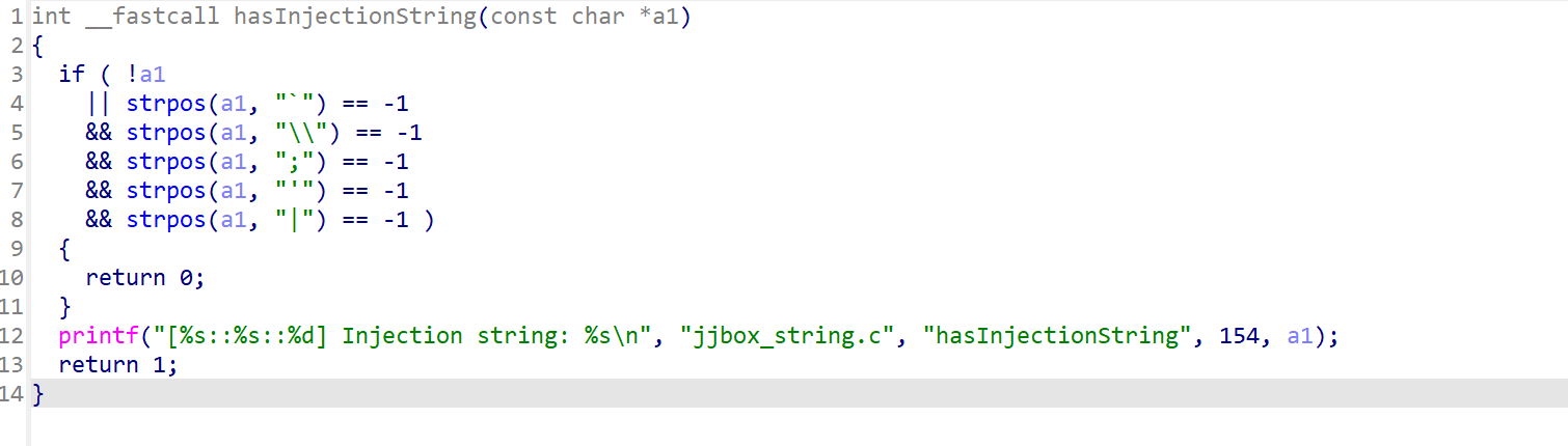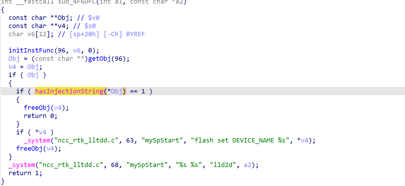 很明显这里调用了hasInjectionString对存放device_name的obj对象进行了check,然后调用_system传入了*obj。